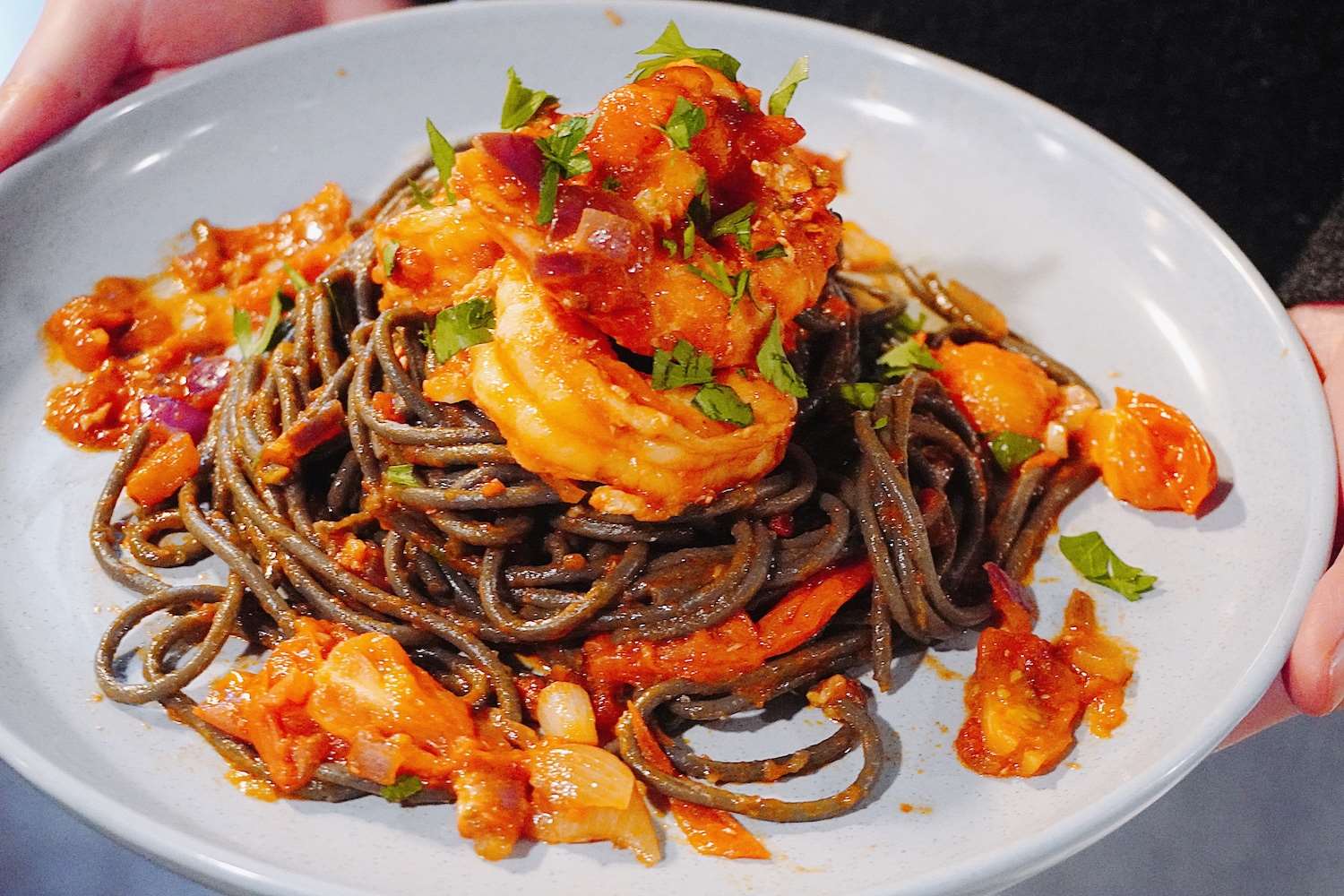 This black squid ink linguine dish is incredibly delicious and the colours of cherry tomatoes add a beautiful contrast to the plate. The dish gives a gorgeous deep savoury flavour combined with the sweetness of the marinated prawns. The recipe works well with almost any type of seafood. Get creative in the kitchen and feel free to add in your favourites! Great with our seafood marinara mix, prawns, squid and mussels. Yum!
