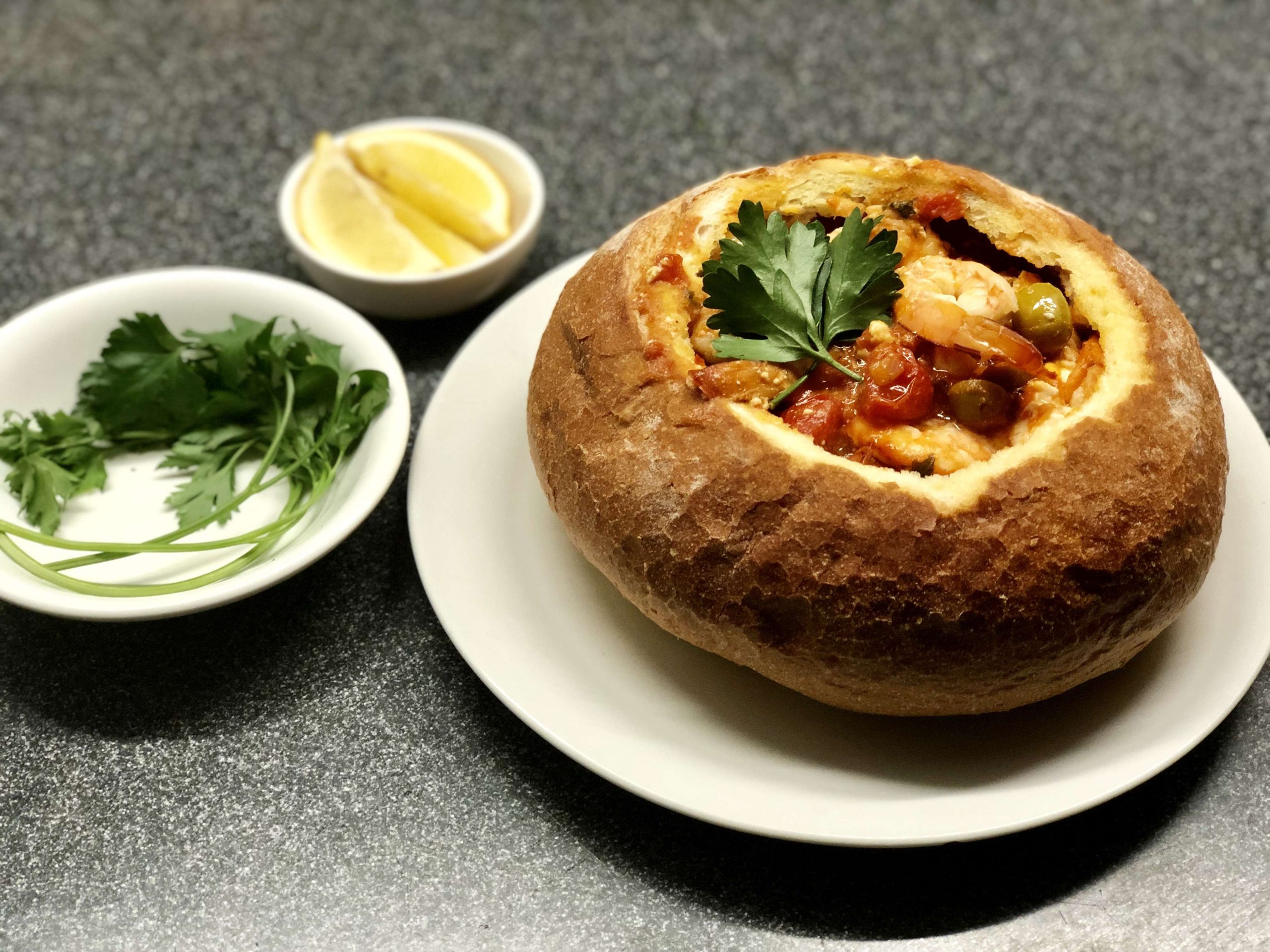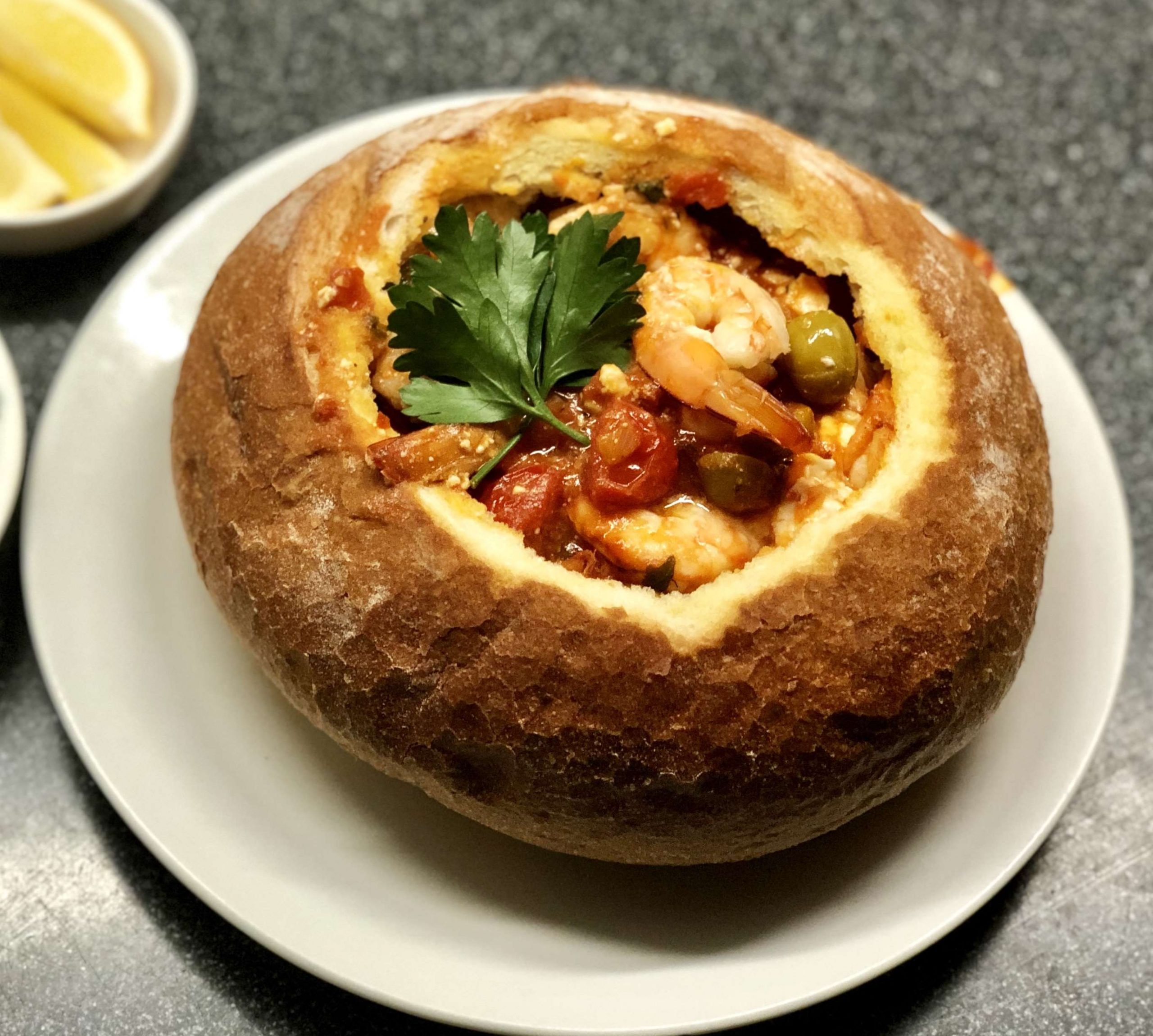 Cut off top of sourdough bread and remove part of centre of make a bowl. Bake for 5 minutes or until crisp. Add prawns and sauce into bowl. Garnish with parsley and lemon wedge.