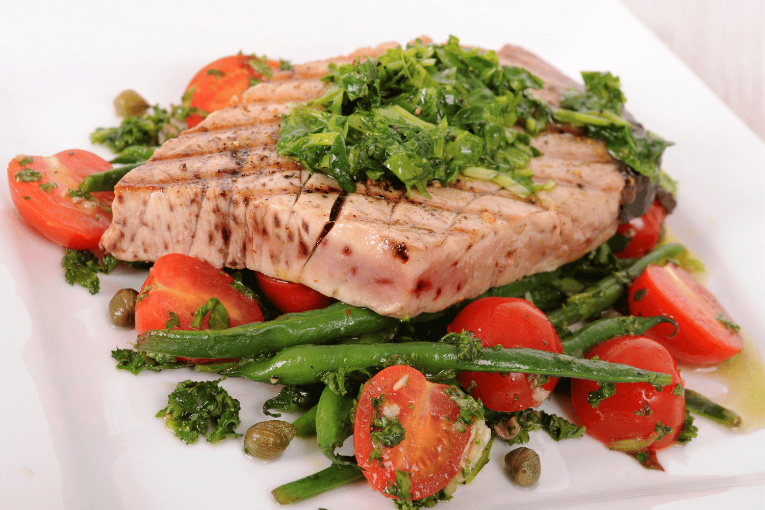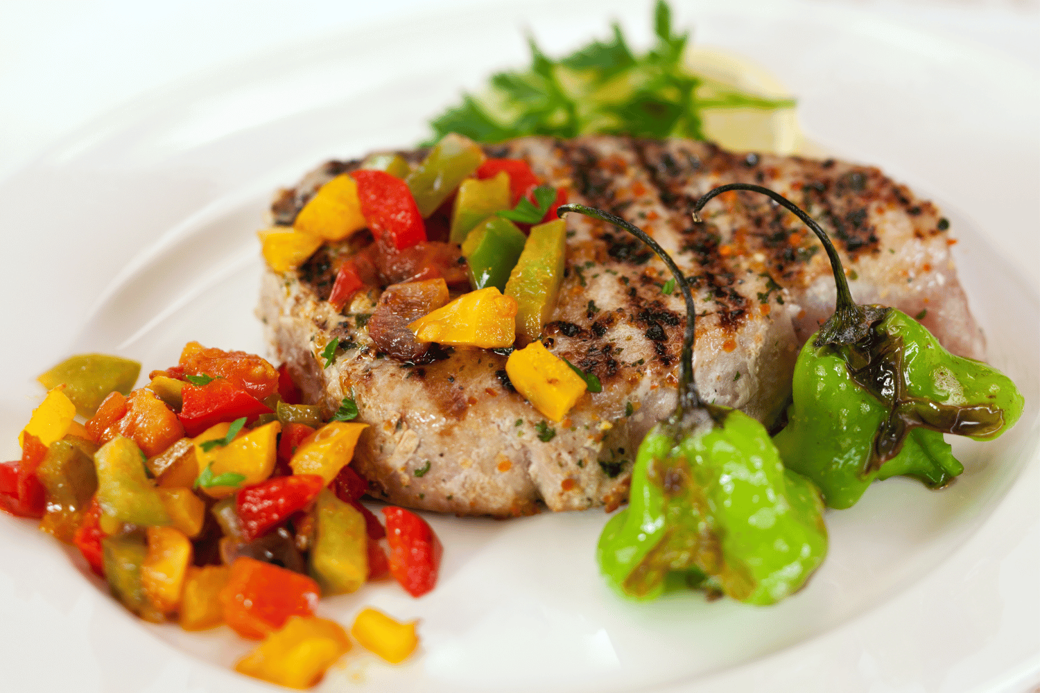 Once your tuna steaks are done, transfer them to a serving plate, garnish with fresh herbs, and season with ground black pepper. The citrusy, garlicky marinade will complement the tuna’s natural flavours beautifully.