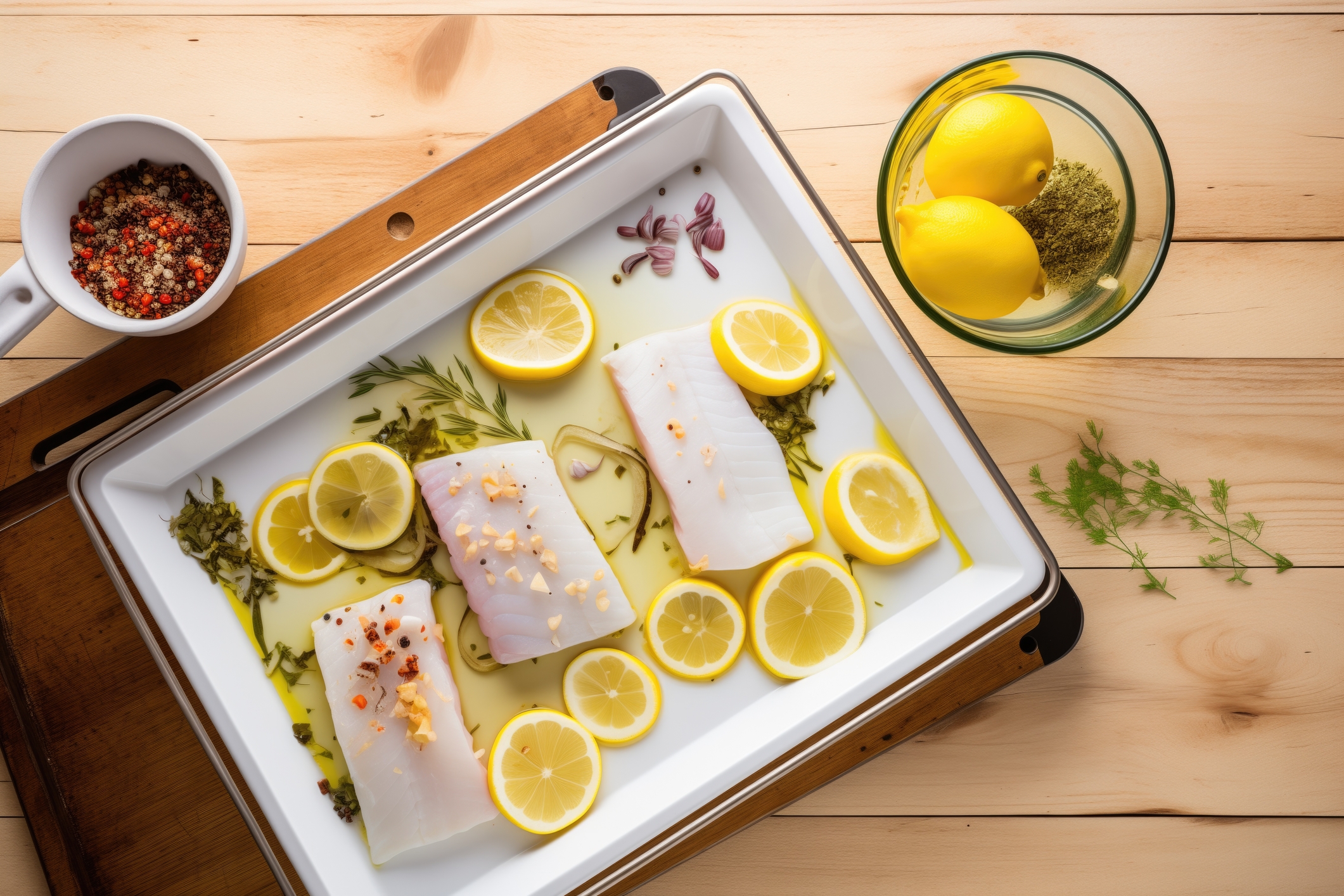 4. Arrange in Baking Dish: Place the seasoned fillets in a baking dish. Arrange lemon slices on top of and around the fillets.