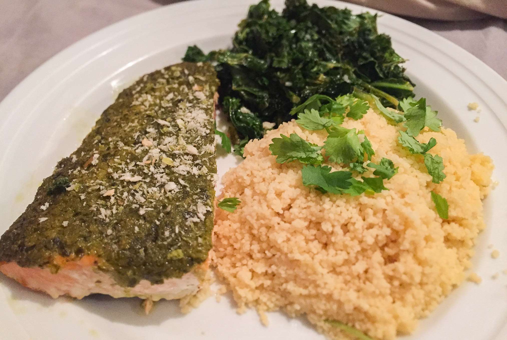 Serve salmon with kale and couscous. Garnish with parsley.