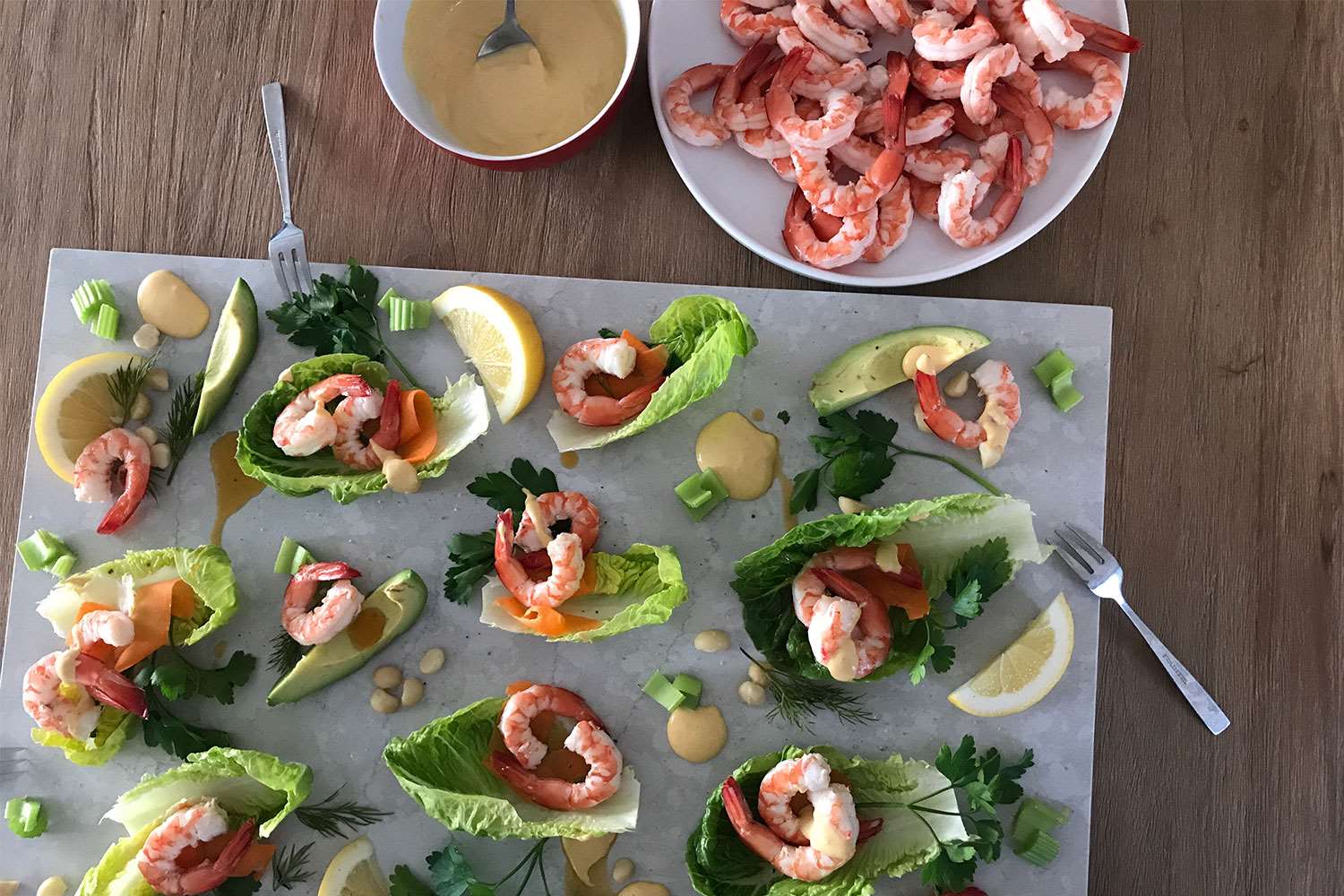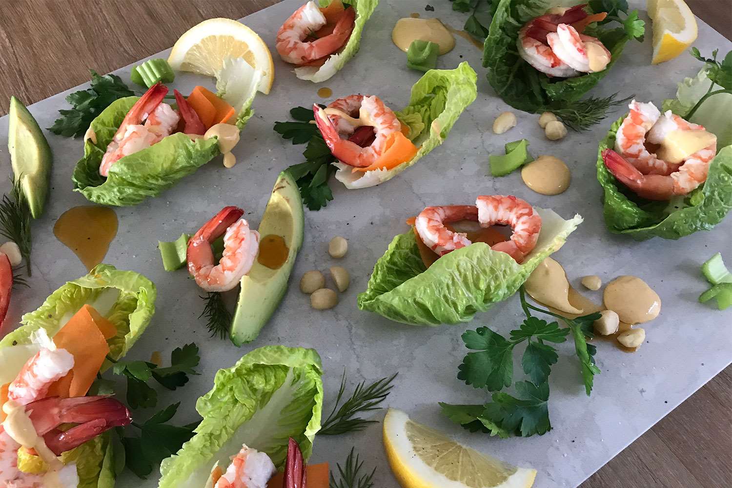 Place 2 prawns inside each lettuce leaf and some around the platter on top of the avocado.