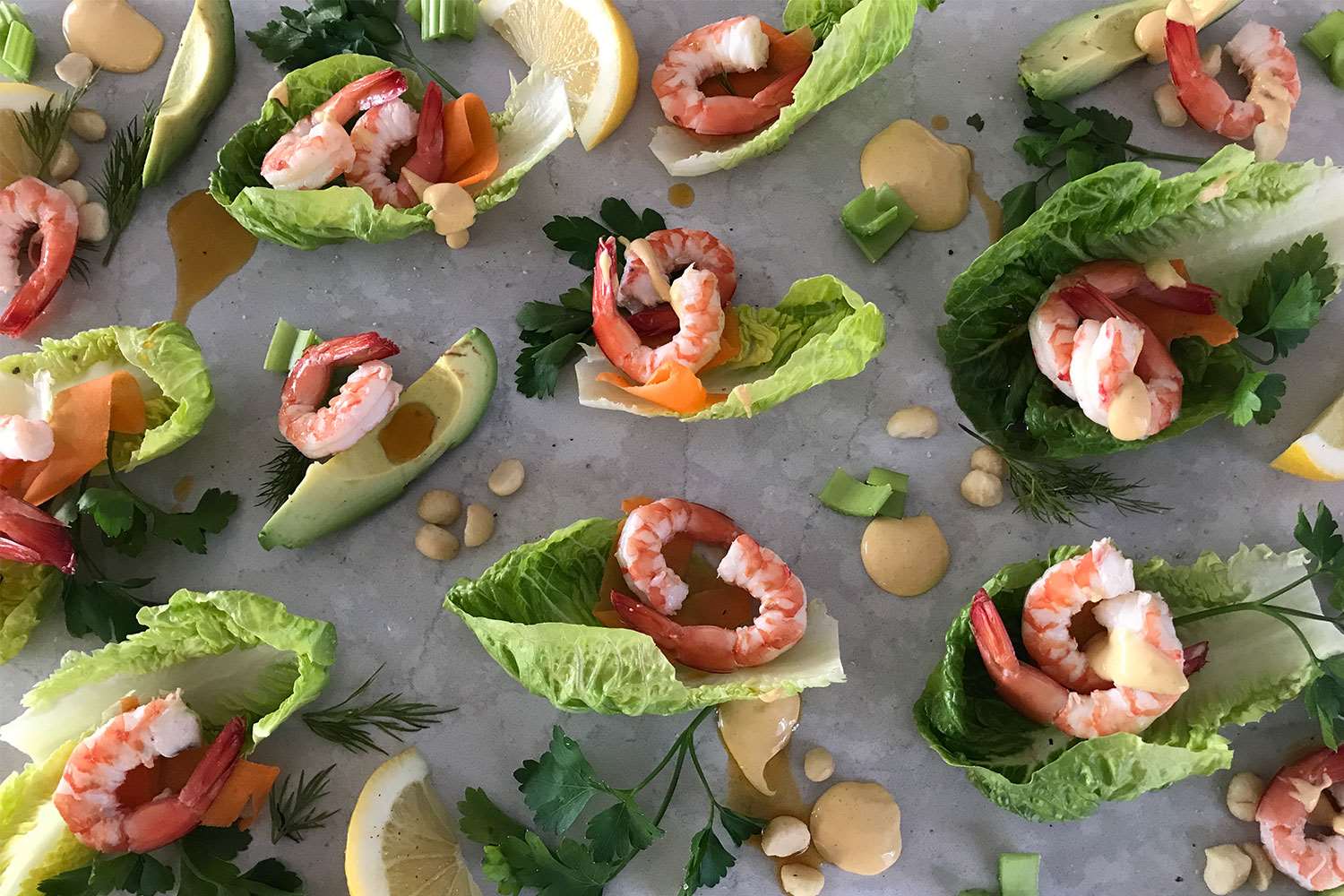 Scatter the avocado, parsley, lemon quarters, macadamia nuts, mango and celery around the platter.