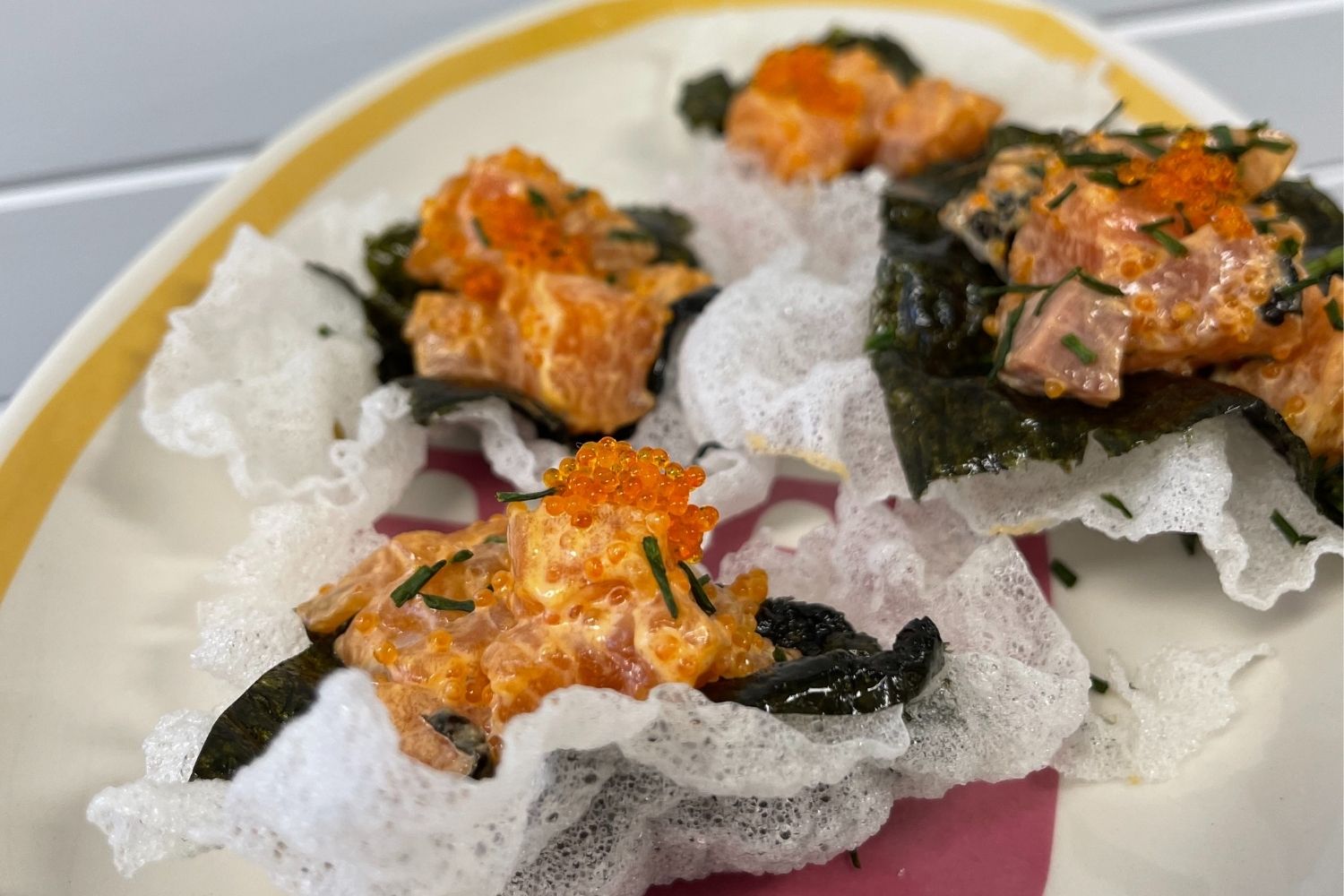 Start assembling by scooping the salmon poke mixture onto the chips and serve.