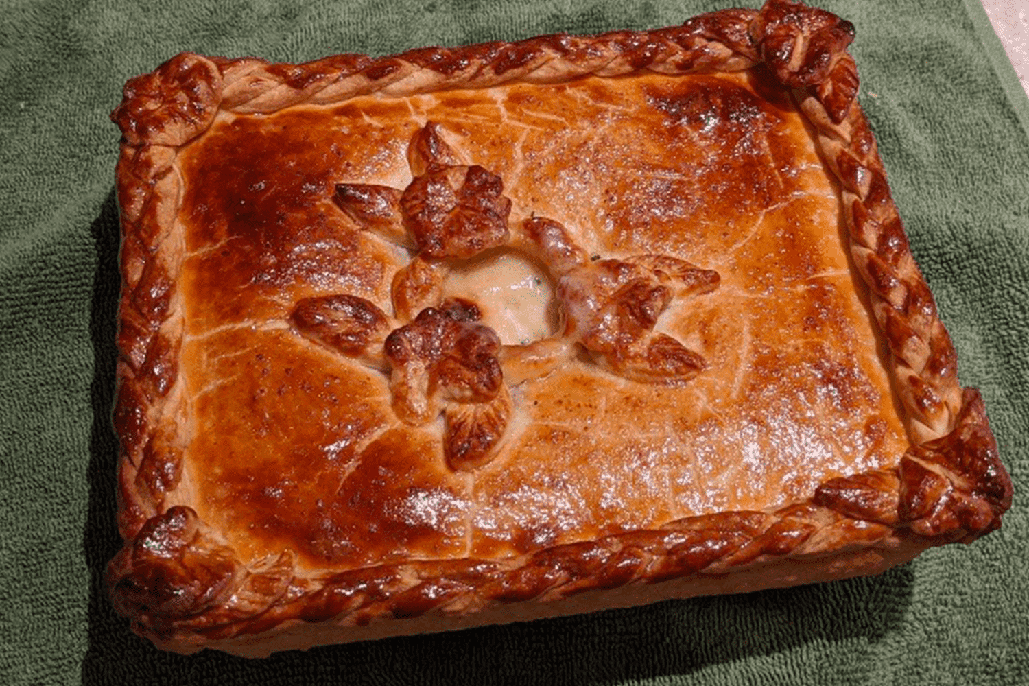 Roll out your dough, with a little flour on the bench to about 2mm thick. Cut to the size of your pie dish, decorate or leave plain. Make a 5cm hole in the centre of your pie dough so it has a steam hole. (You want the dough to be 3cm larger than the pie dish you are using).